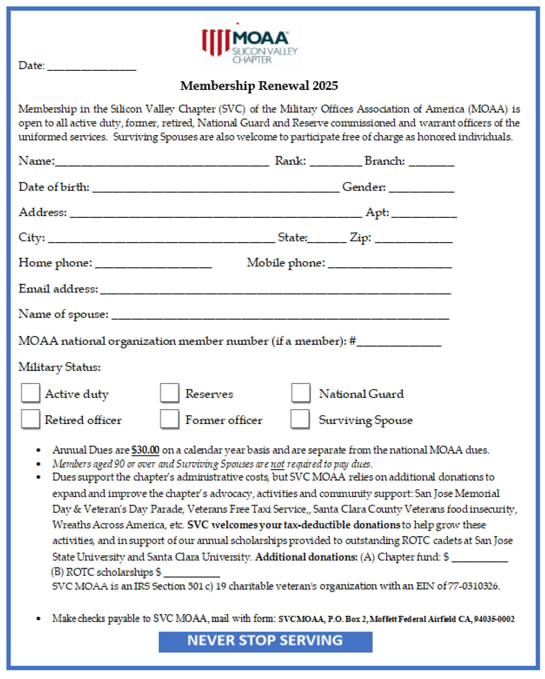 We have set up three ways of applying, renewing and donating. Click the bubble below that’s the easiest for you. You can go on-line to make donations or apply for membership or renew your annual dues. If you prefer, you can donate, apply for membership, or renew manually by printing out the form, filling it in, and mail with your check to SVC MOAA, via US mail, as described on the form.