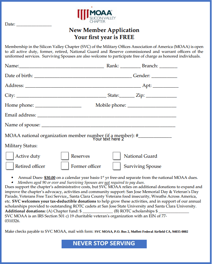 Attention new or renewing members of the Silicon Valley Chapter of MOAA. We welcome all men and women who are, or have, served on active duty, retired and former officers from the U.S. uniformed services. This includes National Guard and Reserve commissioned and warrant officers. Widows and widowers of any deceased individuals who would, if living, be eligible for regular membership may choose to associate with SVC as Surviving Spouses.